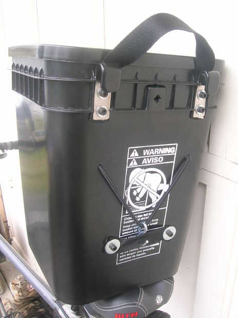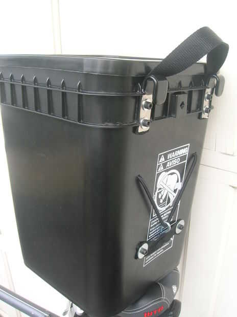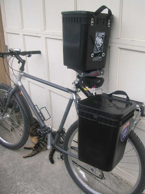 Creo que este es el mejor diseño para una alforja de cubo barato y de alta calidad. Los clips de pannier de Jandd.com son impresionante, fácil de fijar a los cubos y fueron una pieza sólo $1,50. El pensar que quería que no hubiera visto nadie todavía hacer fue conseguir algunos cubos que no eran los gatos de Dios terrible blanco unos. Hice un poco de búsqueda en internet antes de una empresa que vendería me dos cubos del color quería y no cuestan mucho más y luego comprar cubos de gatos. Esto es lo que encontré: