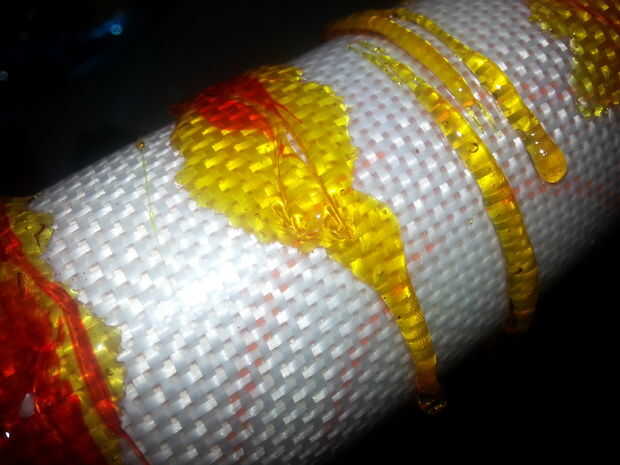Inmediatamente agregar 4 gotas de colorante amarillo y revolver. Con una cucharada cuidadosamente rocíe el azúcar derretida amarillo en el perno de balanceo. Caerá por los lados y eso es lo que quieres hacer. Establecido con seguridad su pan y gotea una gota de colorante rojo en cada una de sus pilas amarillo. Arrastre suavemente un palillo de dientes por el azúcar a la mezcla del amarillo y rojo.