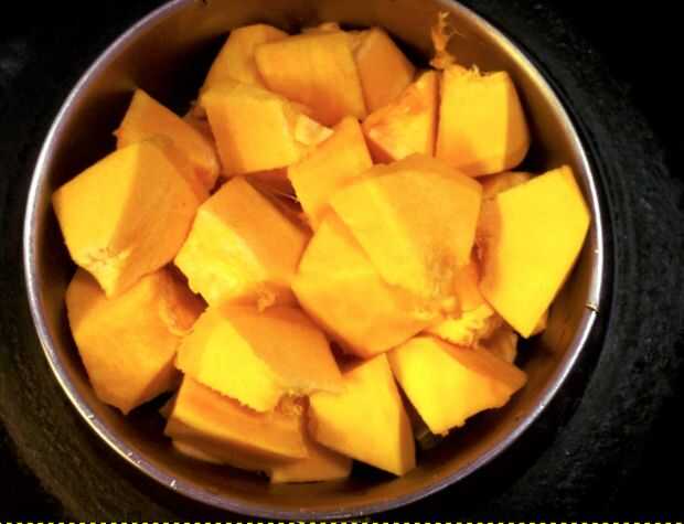 Después de colocar las tartas a la nevera ahora necesitamos hacer el pudín en las tartas. Estoy usando calabaza fresca, pero si usas enlatados entonces puede saltarse esta parte. Usted necesita alrededor de 2 tazas de pudín así cortar la calabaza en trozos y coloque en la licuadora.