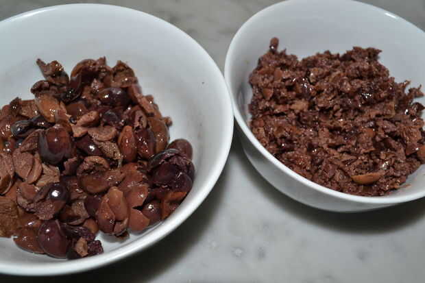 hoyo de las aceitunas y cortarlas en trozos, hacer un puré con la mitad de ellos.