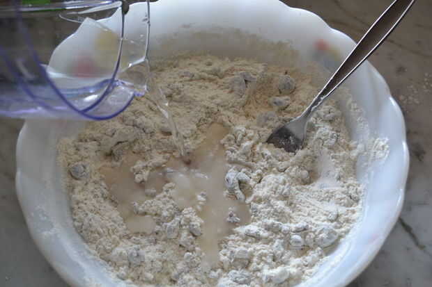 _add agua poco a poco y revuelva con un tenedor, cuando el agua es absorbido (por lo que no haces tu mano frotis).