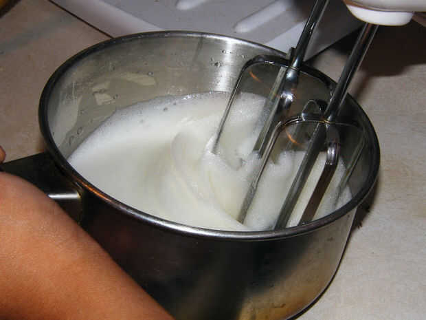 En un tazón por separado y con batidor limpio, bata las claras de huevo hasta montarla