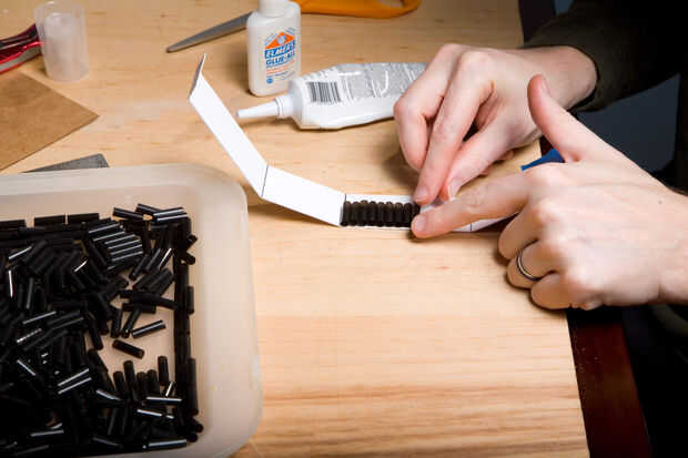 Una vez que esté listo, comience colocando paja, alineándolos con el frente y empuja hacia abajo en la silicona uno tras otro. Cada fila debe ser 14 pajas. Empiece en la parte posterior y hacia adelante, dejando un espacio medio de paja en el extremo cercano. No tienes que ser super exacta sobre alineándolos, silicona permanece pegajosa para un rato y les arreglaremos más adelante. Sólo acercarse.