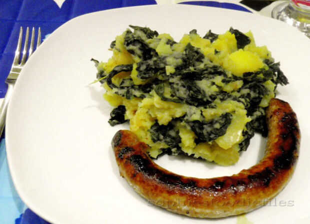 El ayer por la tarde, hace este stoemp de col rizada negro delicioso y había servido con una salchicha de carne de cerdo frita orgánica. Fue una comida muy sabrosa y fácil de preparar. Usted puede hacer vegano sirviendo con chorizos veganos con especias, delicioso, te lo aseguro! Coseché muchas hojas de col rizada negra de nuestra huerta!