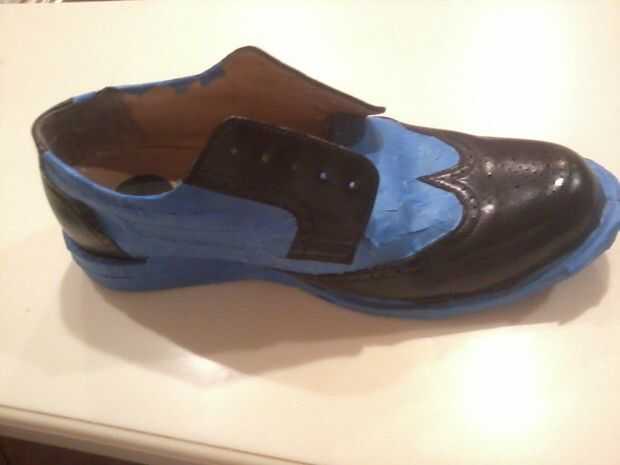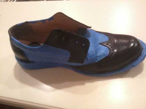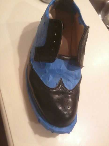 Quitar los cordones de los zapatos. Asegúrese de que los zapatos son bonitas y limpias. Máscara de las zonas que quieres negro. Enmascara la vamp, cuarto, garganta, welt y talón de los zapatos en ambos lados. Dejando la puntera, talonera y ojete áreas expuestas para ser pintado oro. Había metido la lengua en la parte delantera de la zapatilla.