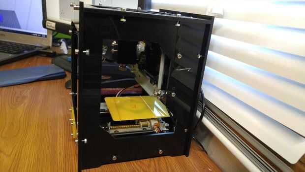 Enchufe el adaptador de pared USB cerca y enchufe el disolvente/más pequeño de los dos cables USB. Es el cordón de alimentación. Debe haber tres LEDs rojos que se encienden para arriba cerca de la parte trasera que se puede ver desde mirando hacia abajo en el grabador. Es un LED en la placa Arduino, y los dos están en los controladores de motor paso a paso.