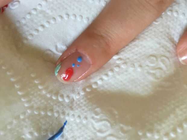 Ahora para las burbujas!! Estas burbujas, tomar el segundo palillo y poner un poco de su color azul. Asegúrese de que usted tiene suficiente color en la punta, pero no tanto que hará que las burbujas parecen más como globos feos. de todos modos, con la punta del palillo, punto en pequeñas burbujas justo encima de la "nariz" del pez. Dibujé unos 3 burbujas (4 en mi pulgar) cada uno variando en tamaño, desde pequeñas a grandes. Para hacer una burbuja grande, unte un poco más pulido en el palillo de dientes.