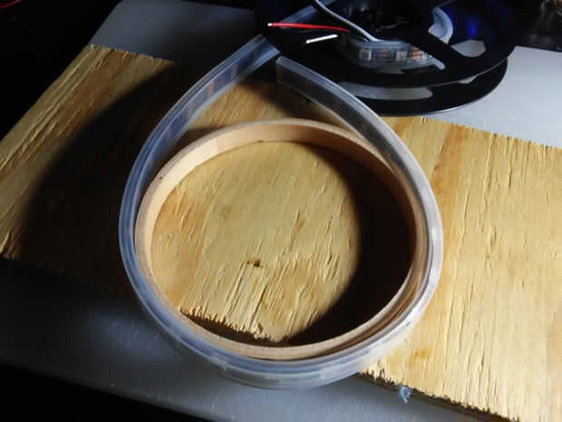 Ahora toma el neopixels y envuelva alrededor de los anillos para medir la longitud de la neopixels necesaria para este proyecto. Es necesario cortar dos tiras para cada anillo, uno para el exterior del anillo y para el interior del anillo. Usted debe ser capaz de conseguir por lo menos 18 píxeles en el aro interior y 20 píxeles en el aro exterior.