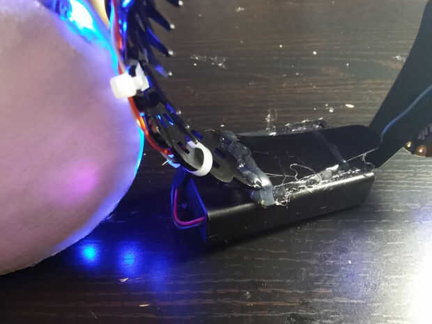 Si no usas el conector JST, o si en cambio usas una junta Pro de baratija, luego cortar el extremo JST y empalme en una extensión de los cables. Una vez que la batería tiene un alambre lo suficientemente largo, puede conectar el paquete a la banda de alice. Pegamento caliente funciona muy bien aquí, pero si quieres espacio para cambiar de opinión, puede utilizar pegamento gorila. En cualquier caso, sugiero fijar con una banda elástica temporalmente para que pueda probar y ajustar la posición según sea necesario. Si pega el paquete demasiado bajo, no será capaz de alcanzar el interruptor de encendido/apagado. Yo he cometido ese error así que ten cuidado. También, demasiado alto y podría hacer contacto con el oído por encima de él, que podría poner tensión en los cables de la unidad.