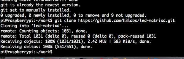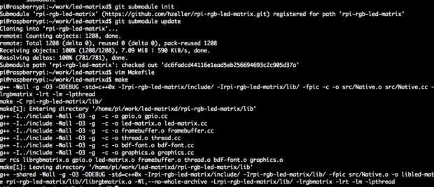 Después de configurar el código en el RPI ejecute los siguientes comandos, que básicamente compilará una biblioteca que se utiliza para cambiar los leds de la matriz led de muchas maneras impresionantes.