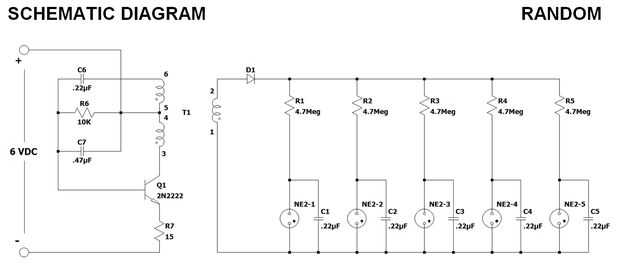 La razón de que este circuito se denomina "Random" es que la tasa de flash para cada lámpara de neón variará dependiendo de la tolerancia de los condensadores, resistencias y lámparas. Muchos condensadores tienen una tolerancia del 10% y 20%. Las resistencias que utilicé fueron tolerancia del 5%. Las lámparas de neón parecen tener leña y mantener voltajes que varían hasta un 20%. Todas estas tolerancias combinadas variará el tipo flash de lámpara de neón real entre.8 segundos y 1,2 segundos. A veces más. Esto resulta en lo que parece el ojo que un patrón flash al azar entre las 5 lámparas de neón. Si te centras en una lámpara se verá que la velocidad de flash es realmente fija para que la lámpara. Las demás lámparas están disparando a diferentes ritmos que crea la ilusión de un patrón aleatorio de flash.