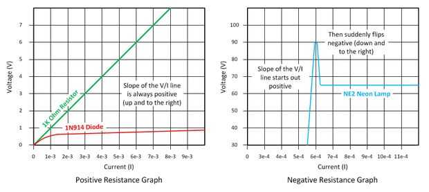 Para tener una idea de lo que se entiende por "resistencia negativa", revisar los dos V / cartas encima. El primero representa una V / gráfico de un diodo y una resistencia, ambos dispositivos de resistencia positiva probablemente ya está familiarizado con. El segundo representa la V / gráfico de una lámpara de neón, un dispositivo de resistencia negativa. Aviso en la resistencia positivo ver que la pendiente de la V / de la curva es siempre positiva (hacia arriba y a la derecha). Aumento actual a través del dispositivo siempre resulta en un aumento de tensión en el dispositivo. Sin embargo, tenga en cuenta que la lámpara de neón tiene una porción de su V / de la curva con una pendiente negativa en el voltaje de avería de la lámpara (90 voltios). En la región de pendiente negativa, aumentando la corriente a través de los resultados de la lámpara en una tensión decreciente a través de la lámpara. Esta característica es lo que hace la lámpara de neón parpadeante en el proyecto Goofy Lite posible.