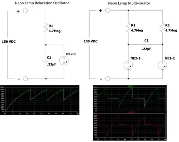En los años 50 y años 60, lámparas de neón fueron utilizadas para construir a todo tipo de interesantes circuitos como osciladores, temporizadores, contadores binarios, divisores binarios, atenuadores de lámpara y detectores de luz. La única desventaja con lámparas de neón hoy es su requisito de alto voltaje (60V a 150V). Pero en el pasado, estas tensiones eran comunes para los circuitos de tubo del electrón (válvula) lo que es muy fácil de utilizar una lámpara de neón. Revise los dos neón lámpara esquemas anteriores. Uno es un circuito oscilador de la relajación y el otro es un circuito multivibrador. El oscilador de la relajación se utiliza en la versión de Random del proyecto Lite Goofy. El multivibrador se utiliza en la versión secuencial del proyecto Lite Goofy. A continuación es una descripción del funcionamiento de cada circuito: