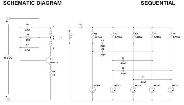Todos los principios descritos anteriormente aplican a los circuitos secuenciales. La única diferencia es donde se unen los condensadores. La versión secuencial de Goofy Lite se compone de varios circuitos multivibrador distribuidos entre las 5 lámparas de neón. Revisar el diagrama de circuito secuencial anterior y la tabla adjunta.