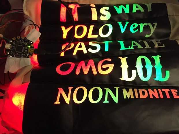 Configurar el IDE para trabajar en la detección de la placa y ejecute el bosquejo strandtest para probar su neopixels. Mapa a qué segmentos de la tira de neopixel corresponden a las palabras que desea contraluz y programa que en. Usé el método de fuerza bruta de la codificación a la luz hasta la mitad izquierda y derecha de cada fila. Entonces puedo luz encima de cada bloque en secuencia para formar las frases de reloj word. Si alambré secuencialmente por todas las filas, yo probablemente podría han mejor utiliza matriz dirigiéndose a la luz hasta la matriz de neopixel.