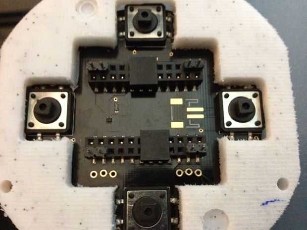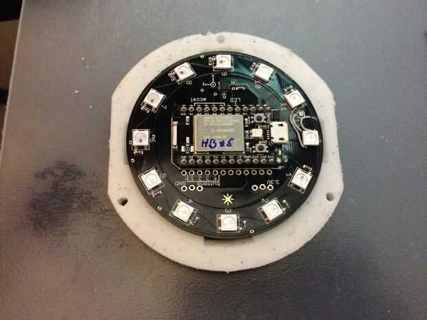 Como el escudo botón de Internet sin agujeros para tornillos, solía la parte posterior del conector del encabezado en el escudo mantenga un perfboard con la incertidumbre de embutido. El forro interior tuvo que ser hecho cuidadosamente, por lo que se colocaba el escudo en el centro de la carcasa del reloj. Como un bono adicional, las patas de la cabecera en el perfboard facilitan después de la soldadura en el cable USB para la alimentación.