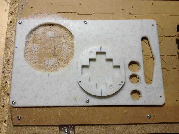 Como impresora 3D de nuestro espacio de Hacker no es accesible por el momento, utilicé mi molino de Shapeoko CNC para cortar un pedazo de viejo 7mm HDPE tabla de cortar. Material suave es ideal para atornillar los tornillos de madera en, y estaba bastante contento con el polietileno de alta densidad para este propósito.