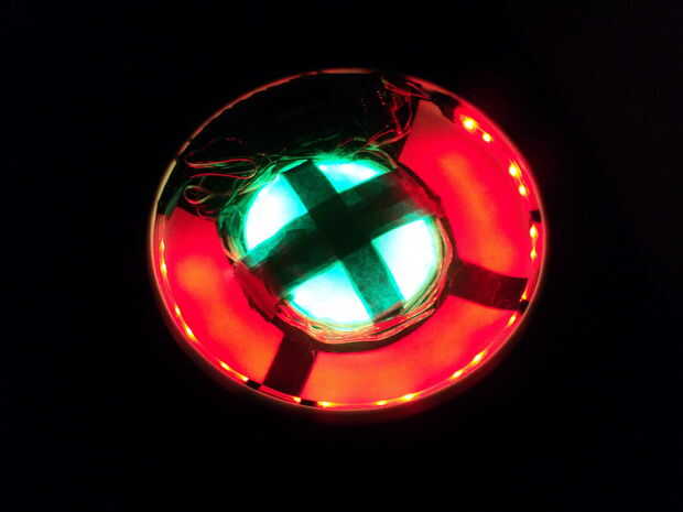 La tira de Neopixel en el exterior se monta en el labio interno de la llanta de disco volador.