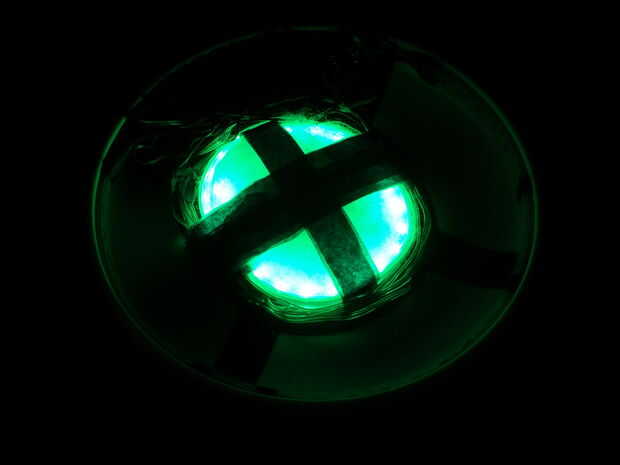 Puse algunos loops de cinta en las tiras de Neopixel como un encolado superficial y caliente pegado al disco de plástico. Le puse un pegote extra grande de pegamento para adherirla. El exceso de pegamento caliente parece pegarse a la vaina de silicona pero probablemente podría ser pelado apagado si es necesario. Tenga cuidado cuando apretándolo como el pegamento caliente se toma un tiempo para enfriarse.