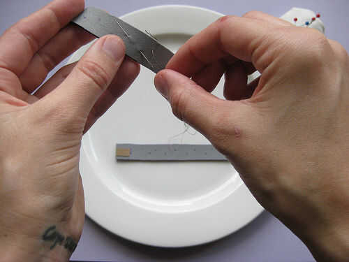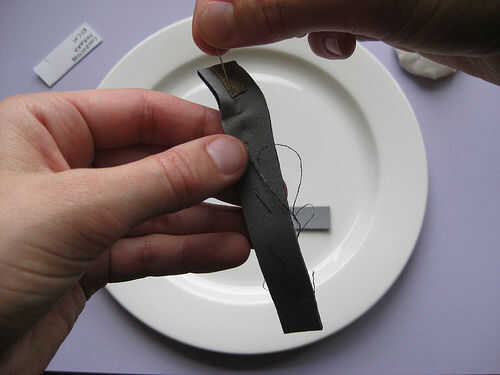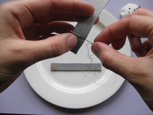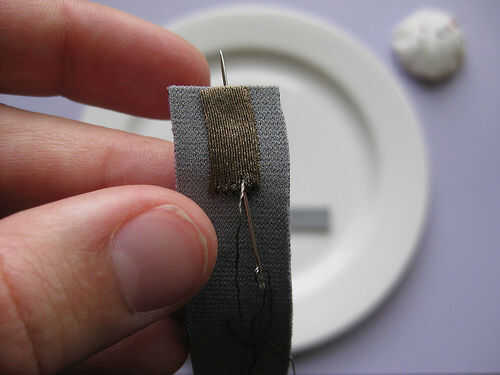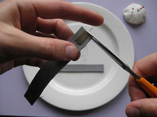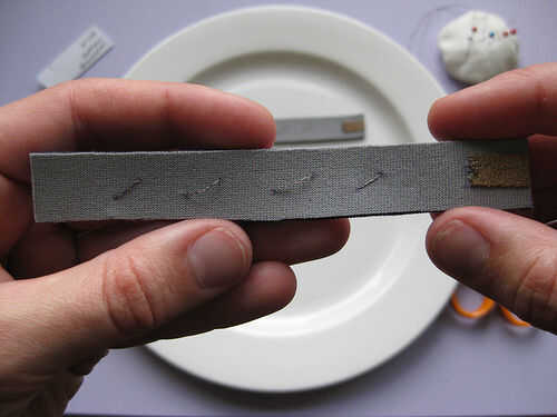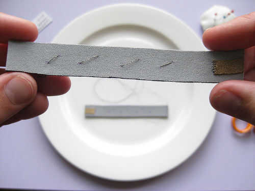 con hilo conductor, Velostat y neopreno, coser su propio sensor de doble tela.Este sensor de curva reacciona realmente (disminuciones en la resistencia) a la presión, no específicamente para doblar. Pero porque se intercala entre dos capas de neopren