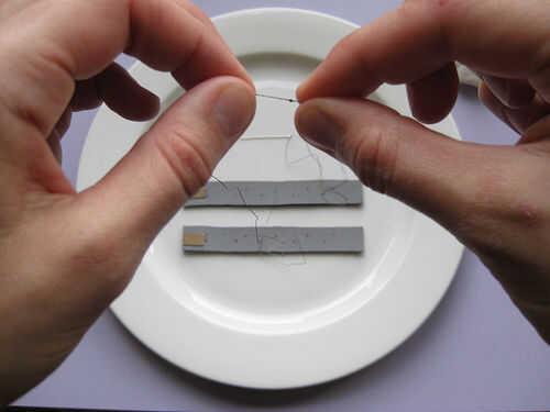 Hay variedades de sensores del estiramiento con formas diferentes en el mercado. Anterior es el sensor de estiramiento de goma conductora, que es uno de los más común y más baratos que se podía conseguir. Generalmente viene con dos clips metálicos en