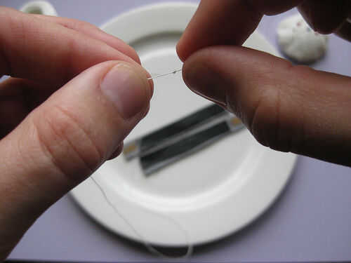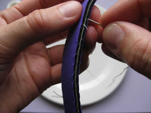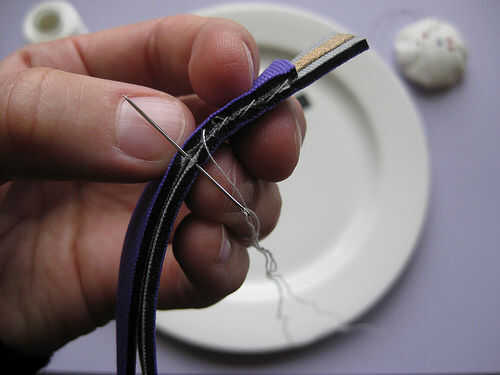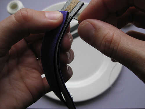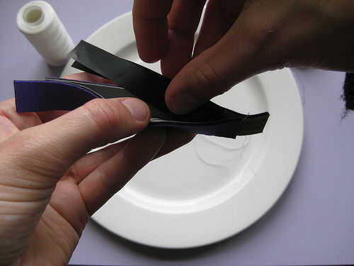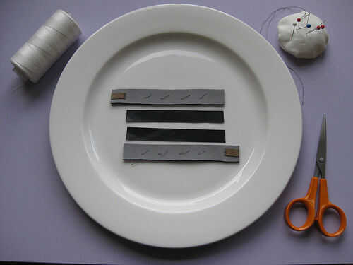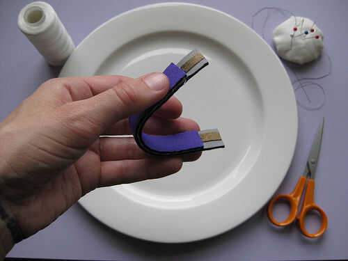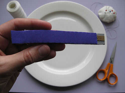 con hilo conductor, Velostat y neopreno, coser su propio sensor de doble tela.Este sensor de curva reacciona realmente (disminuciones en la resistencia) a la presión, no específicamente para doblar. Pero porque se intercala entre dos capas de neopren