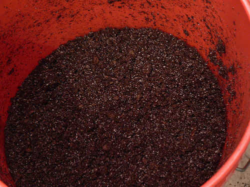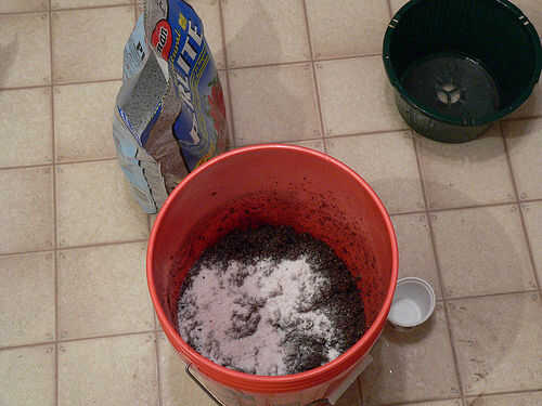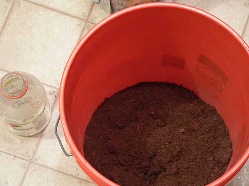 he añadido sobre un litro de agua a mi cubo. Está bien mezclar esto con las manos ya que no contiene nada realmente nociva como estiércol de la vaca.