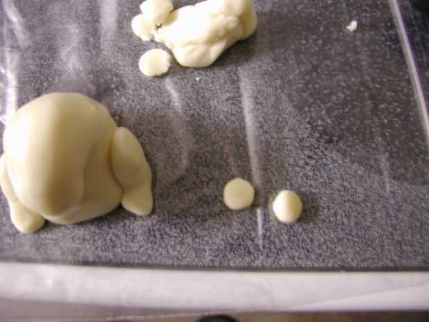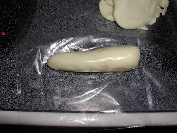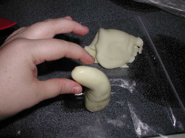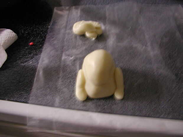 Primero quiere sacar suficiente chocolate para hacer su cuerpo. Quiere rodar el chocolate modelado en arcilla como si fuera haciendo un breadstick. Aunque desea un lado y a ser más gruesa que la otra (forma de cono). Luego doblar la parte más pequeña de la masa sobre el más grande para hacer cierta separación de la cabeza y el cuerpo.