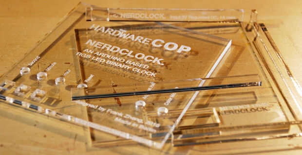 Para conseguir el NerdClock parezca completa y no prototypish, me decidí a dar un caso de acrílico. Solo un básico, no diseño de lujo (realmente no sé cómo hacer la suposición) que podría recortar de un panel de acrílico transparente grueso de 3 mm de 25 x 15 cm. Tan pegada a un diseño cuadrado llano que es apenas lo suficientemente grande tengo el reloj binario PCB en su lugar. La fundamental fue creada en MakerCase (http://www.makercase.com) he añadido un texto grabado y los orificios necesarios. Listo para el cortador del laser!