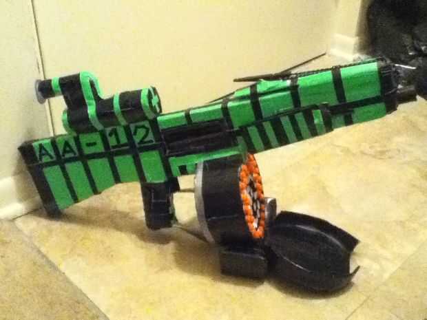 aquí es la pistola de banda de goma blogun Nerf AA-12 que construí. Tiene 60 y tantos dardos en el área de almacenamiento de "tambor mag". Mi décimo post!!!!!! ' Ibles hecho bajo petición. POR FAVOR DEJA COMENTARIO! Seguir, favoritos y Echale mi Instructables otros! ¡ Gracias! ¡ Disfrute! (Hice esta pistola de un amigo).