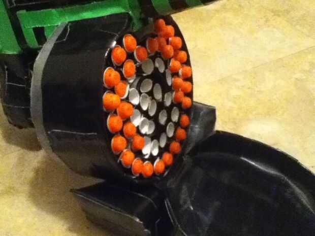 He modificado una Blastzooka extrema BuzzBee para disparar 6 Nerf dardos elite, estilo de la escopeta. Inicialmente lo hizo disparar dardos solo, pero era demasiado poderoso como para dejar que mis hijos utilizan. Deja ronchas en su cuerpo y también
