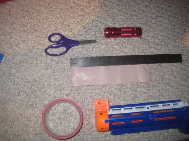Los materiales para esto son una extensión de cañón de Nerf, un par de buenas tijeras, sobre una de ocho pulgadas pedazo de cinta adhesiva y una linterna.