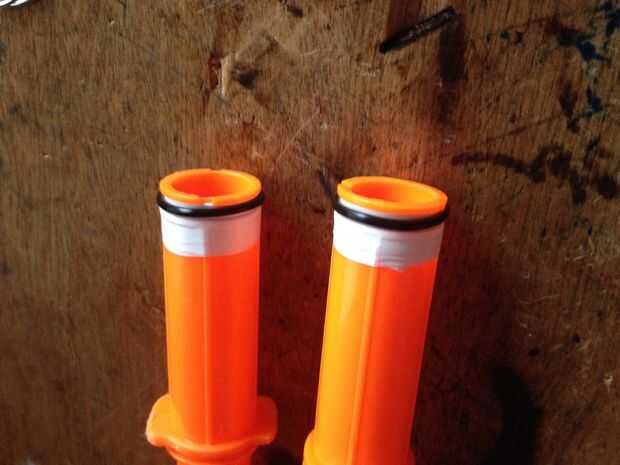Ahora quieres tomar cinta selladora de roscas y Envuélvala alrededor de donde va la junta tórica. Y vuelva a instalar la junta tórica. La cinta se empuje hacia fuera de la Junta para crear un buen sellado contra la parte interior del pistón.