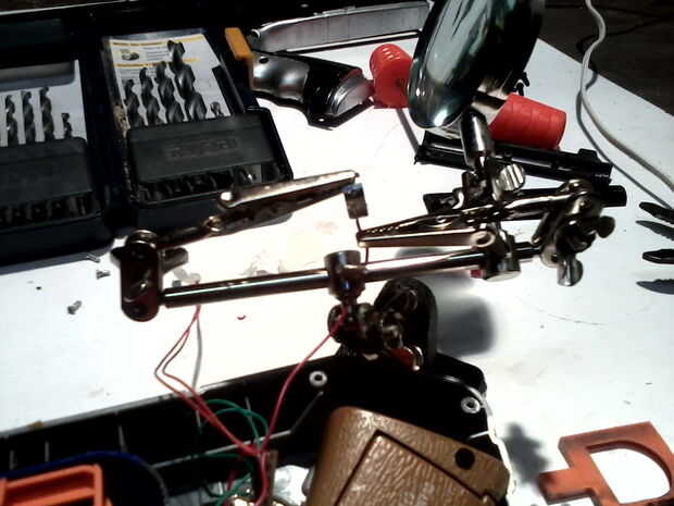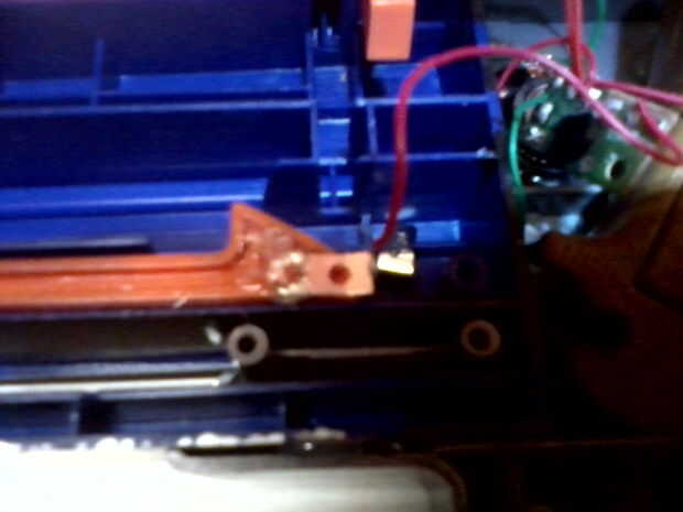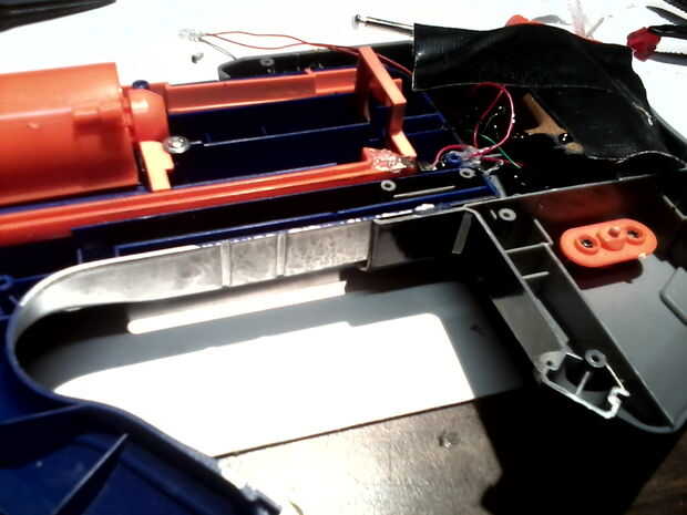 poner en contacto en el extremo o lo triángulo gatillo y pegamento en el extremo cuidado que los cables son delgados y se me flojo tuvo que fijar uno. Pegamento del contacto abajo y coloque el siguiente contacto en la parte posterior del orificio del tornillo y cola en su lugar. Asegúrese de que al apretar el gatillo que los contactos toquen y hacen el arma ruido entonces ir hacia atrás y poner todo junto y usted tiene usted mismo un arma de Nerf que hace sonidos cuando el gatillo teniendo dos armas para hacer una es simplemente más divertido