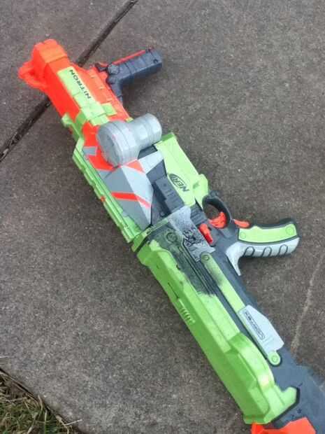 He modificado una Blastzooka extrema BuzzBee para disparar 6 Nerf dardos elite, estilo de la escopeta. Inicialmente lo hizo disparar dardos solo, pero era demasiado poderoso como para dejar que mis hijos utilizan. Deja ronchas en su cuerpo y también