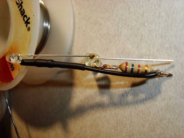El cable negativo de la fuente de energía debe ir a los extremos de una resistencia tal como se muestra. Se comparte sólo lo positivo.