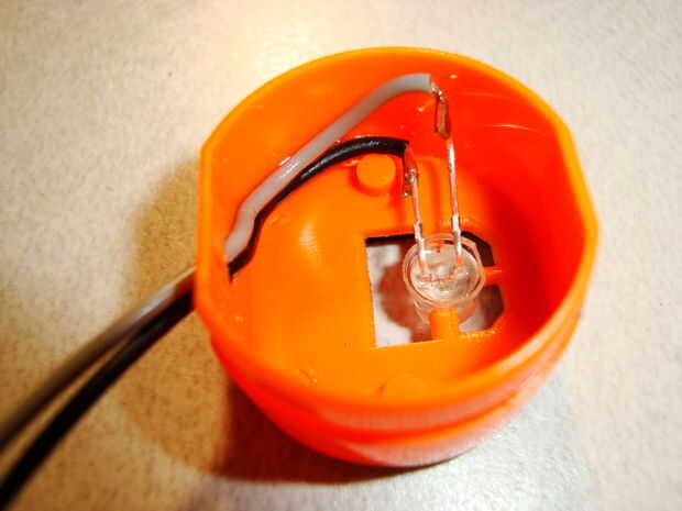 Soldar ambos cables con cerca de 5 pulgadas de alambre. Sólo los dos cables de alimentación a través del agujero pequeño en la parte superior y dirija el cableado lo hice en la imagen. Debe aferrarse a la derecha de la pared. Cuando el pegamento hecho el LED, el cableado y la zona donde los cables no pasan a través del agujero aire gotea desde la parte superior.