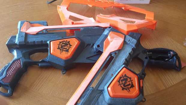 Esto nos lleva a lijar. Prefiero las pistolas de pintar para tener un aspecto limpio y acabado. Para ello me gustaría quitar todos los logos de Nerf y etiquetas de advertencia (nuevamente, tenga en cuenta que al hacer esto usted está tomando su seguridad en sus propias manos). Empiezo este proceso usando una Dremel para bajar la mayoría de los logos, no sé el grano exacto del tambor de lijar pero mi conjetura es que es alrededor de 60-80 grano. Tenga cuidado de no cavar demasiado profundamente en el plástico! Es mucho más difícil de fijar, pues toma tiempo y arena ligeramente al utilizar una herramienta eléctrica. Debido a la arenilla bajo de la Dremel, después de retirar la mayoría de la insignia que lijar a mano usando primero una lija de grano 120 para comenzar a alisar hacia fuera entonces un mayor papel de lija de 220 grano para lograr el acabado que quería. Recomiendo utilizar en grano 220 si no más para el final de la arena. Este proceso puede ser tedioso, pero sea paciente! Cuanto más tiempo que llevas con este paso se traduce directamente a la apariencia final de la pistola.