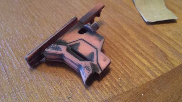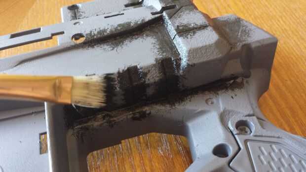 Para el cuerpo ahora gris de la pistola, también quería darle un look Grunge. Básicamente, para darle un aspecto sucio o utilizado, quería parecer suciedad y suciedad acumulados en los espacios más pequeños que normalmente no limpiarse el uso normal de forma. Para ello, utilicé una pintura de arte de acrílico para llenar en todos los rincones y grietas en el cuerpo (fotos 6-8). Después de dejarlo seco usé un trapo húmedo para limpiar el exceso de pintura dejando solo una mirada sucia en todos los espacios pequeños. Como se aprecia en el cuadro 9, después de limpiar la mayoría, es la pintura sólo negra que reside en los pequeños espacios.