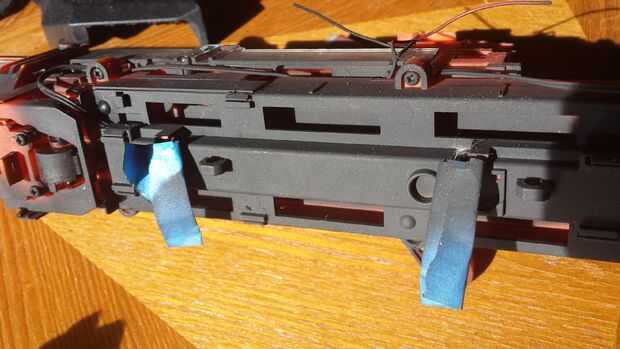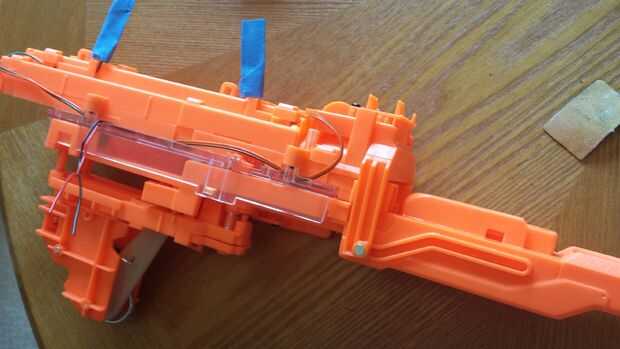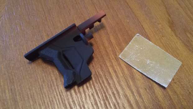 En cuanto a la punta naranja del cañón, la corredera y el gatillo que decidí hacer algo un poco diferente. Para estas piezas yo no arena, limpie con acetona ni cebar. En cambio elegí rocíe con una capa delgada de mi pintura en aerosol negra claro y luego la arena más revelador y manteniendo la seguridad naranja, dándole el aspecto de "Grunge" estaba tratando de lograr (cuadros 2-3). Nota: Como se ve en las fotos 4-5, usé cinta de pintor para cubrir los LEDs en cuanto a pintura no sobre ellos.
