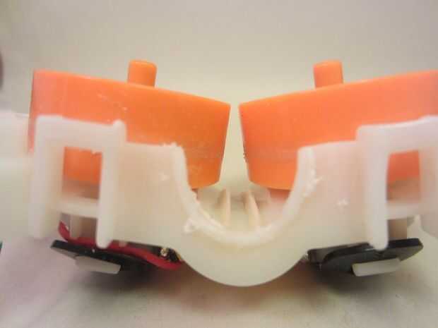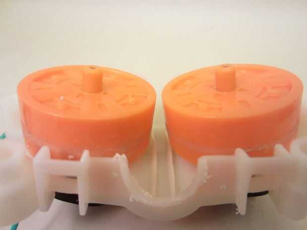 Usar una pistola de calor, calentar la parte inferior del montaje del motor hasta que se puede doblar. De la curva hasta que las dos ruedas naranja aprox. 1 mm, como se muestra. Usando una herramienta giratoria, corte cualquier plástico derretido que impide que las ruedas girando libremente.