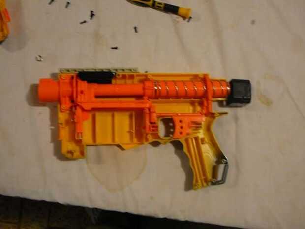 Desmontar el cuerpo de la recon y retire el muelle. Guardar la extensión del barril. No deje los tornillos ahí para no confundirlos con los tornillos de Longshot. por alguna razón, las notas no están funcionando en la siguiente imagen para ponerlos aquí, que este no es mi foto y tome el resorte grande hacia fuera.