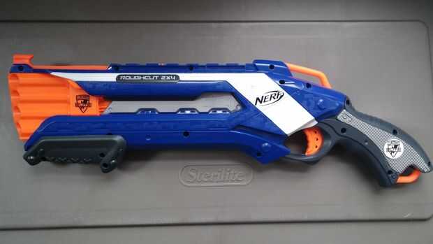 He modificado una Blastzooka extrema BuzzBee para disparar 6 Nerf dardos elite, estilo de la escopeta. Inicialmente lo hizo disparar dardos solo, pero era demasiado poderoso como para dejar que mis hijos utilizan. Deja ronchas en su cuerpo y también
