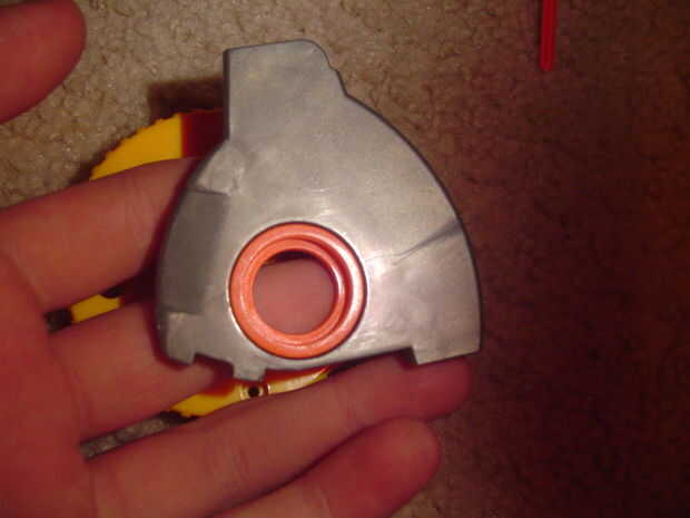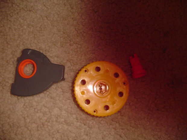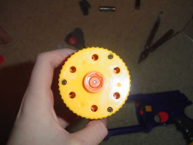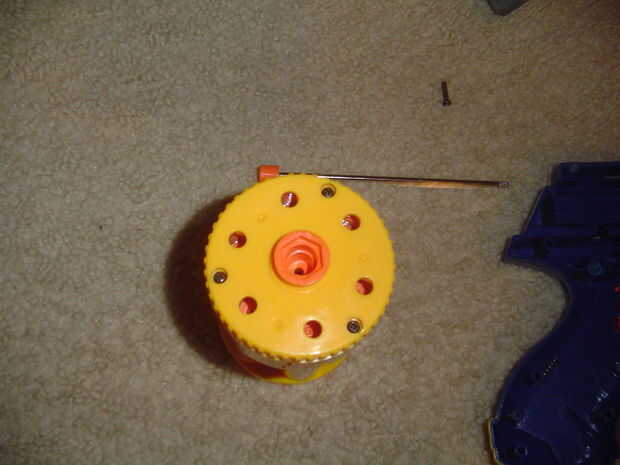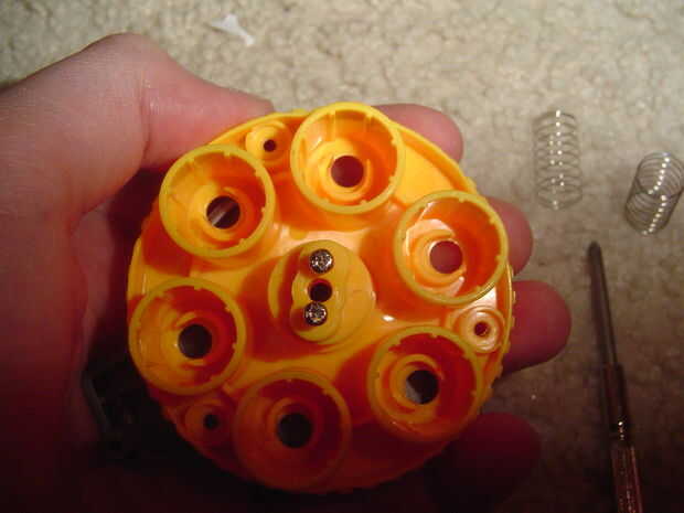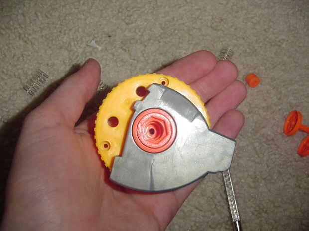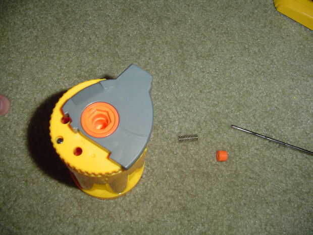 tirar las piezas grises en direcciones opuestas para tirar una pieza naranja la barra metálica. Tire de la pieza gris de la parte delantera. luego Desenrosque la parte de atrás del cañón y sacar. Dale la vuelta y destornillar los 2 tornillos que sujetan las piezas grises y naranja. una vez hecho esto es tirar el gris pieza apagado pero mantener la pieza naranja. ahora Atornille la pieza naranja sólo y luego atornille la parte posteriora otra vez. Empuje la varilla del metal a través del frente y luego coloque el resorte en. Ahora empuje el anillo naranja otra vez.