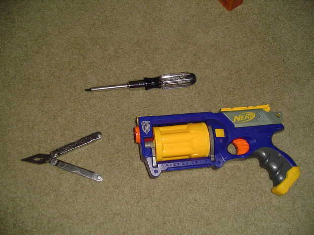 hoy vamos a tomar esta Nerf Maverick, ya modificadas y pintarlo.Qué te pintamos:CañónCáscaraArmado de MechBotón de liberación del barrilPaso 1: Lo que usted necesita Se necesita:Nerf MaverickDestornilladores (phillips y plana)Cortadores de alambreSpr