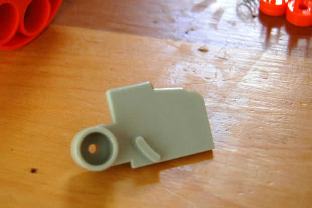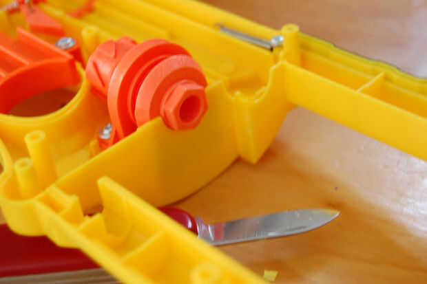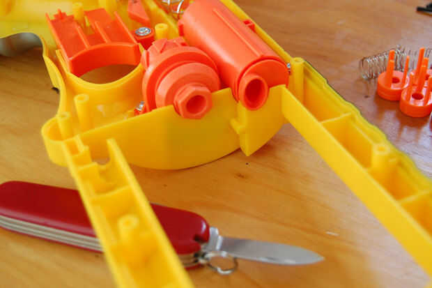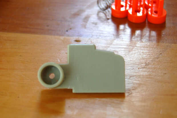 En la parte frontal de la pieza de la bisagra delantera es una pequeña protuberancia rectangular. Se trata de la primera mitad de la cerradura de la revista. Cortar. Una vez que haya terminado, asegúrese de que la superficie es bastante lisa. (Foto 2). Una vez que haya terminado, vuelva a montar el ensamblaje de cañón. Si usted está confundido acerca de cómo hacerlo, consulte el paso 2.