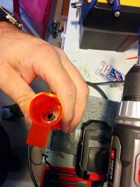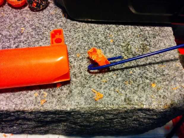 Utilizo una percha doblada para quitar los trozos que se atascan en el Asamblea de barril.