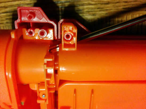 Levante el tubo del cuerpo de la pistola del extremo con el post de punto de mira. Una vez que el frente surge, el cañón puede tirar lejos de la primavera.