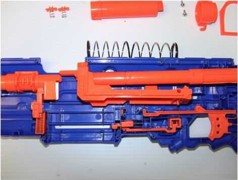 Tip: En la Longstrike, todo dentro del tubo de émbolo se puede quitar, pero tenga cuidado de no perforar las paredes del tubo. Si agitas el tubo del émbolo, debe oír algunas partes confunde todo.