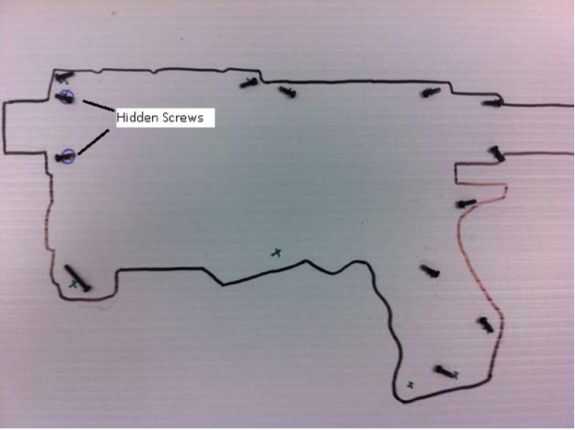 Paso 2: Quite los tornillos. Asegúrese de tomar nota de la colocación de los tornillos, porque son de diferentes tamaños. Es útil colocar los tornillos sobre la mesa en sus posiciones originales correspondientes a un esquema de la pistola. Hay un total de 15 tornillos. (Fig. 2)